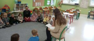 W ramach przedszkolnego projektu “Czytanie na dywanie-historie bohaterów bez peleryny” grupa “Ananasków” miała wyjątkowego gościa. Naszą grupę odwiedziła pani Dominika, mama Marysi, która z ogromnym zaangażowaniem przeczytała dzieciom pełne emocji i mądrości opowiadanie o “Hipopotamie Grzesiu”. Spotkanie wywołało wśród przedszkolaków wiele radości. Dzieci z zaciekawieniem słuchały historii, chętnie odpowiadały na pytania i dzieliły się swoimi przemyśleniami na temat odwagi oraz pomagania innym. Wizyta pani Dominiki była dla “Ananasków” nie tylko okazją do poznania nowego bohatera, ale także piękną lekcją, że siła charakteru nie zawsze tkwi w nadzwyczajnych mocach, lecz w dobrym sercu i wytrwałości. Dziękujemy pani Dominice za poświęcony czas, ciepło i inspirującą historię, która na długo pozostanie w pamięci dzieci.