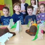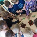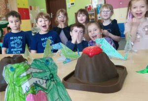 Dzień po dniu dinozaura, przedszkolaki z grupy 6B “Ananaski” eksperymentowały z sodą oczyszczoną, barwnikiem spożywczym i octem. Stworzyły małą makietę świata dinozaurów i mogły obserwować wybuchy wulkanów. Dodatkowo dzięki cynamonowi sprawdzały jak można włożyć palec do wody tak, żeby pozostał suchy 🙂