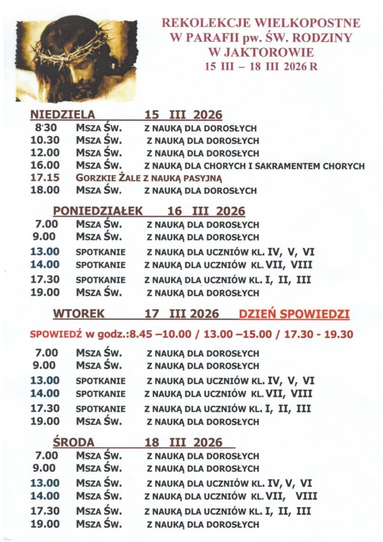 W dniach 16, 17 i 18 marca 2026 odbędą się rekolekcje wielkopostne.